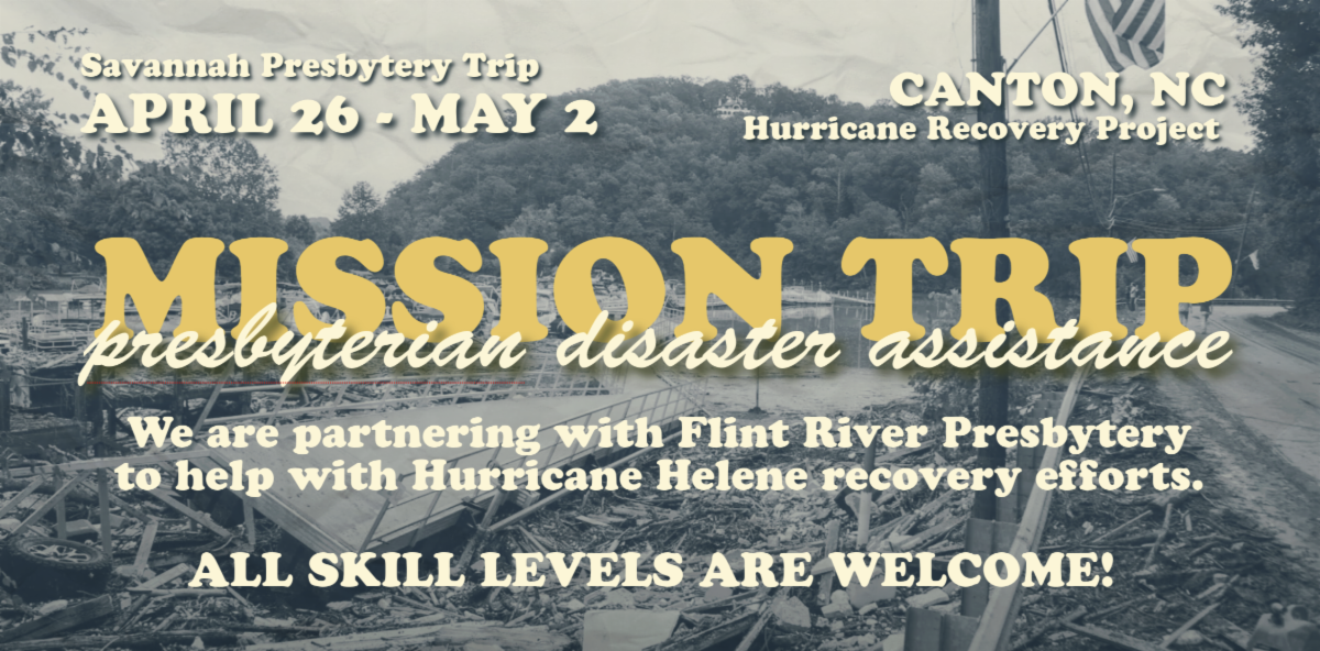 Flint River & Savannah Presbyteries have been coordinating with PDA in Canton, NC to participate in Hurricane Helene Recovery work during the week of April 26-May 2. They have space at Canton Presbyterian for additional participants and want to invite churches and groups from the Presbytery of Greater Atlanta to join.