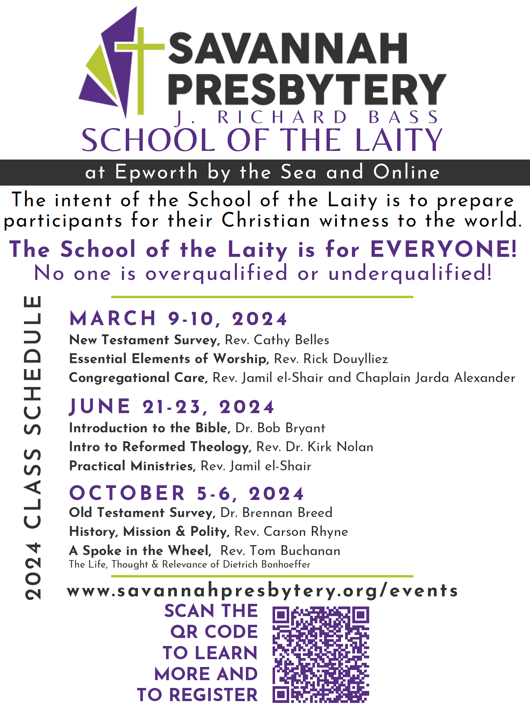 Savannah Presbytery School of the Laity Friday, June 21, 2024 12:00 AM Sunday, June 23, 2024 10:59 PM Google Calendar ICS Information/Registration: https://www.savannahpresbytery.org/events/christian-education-events/school-of-the-laity-classes/