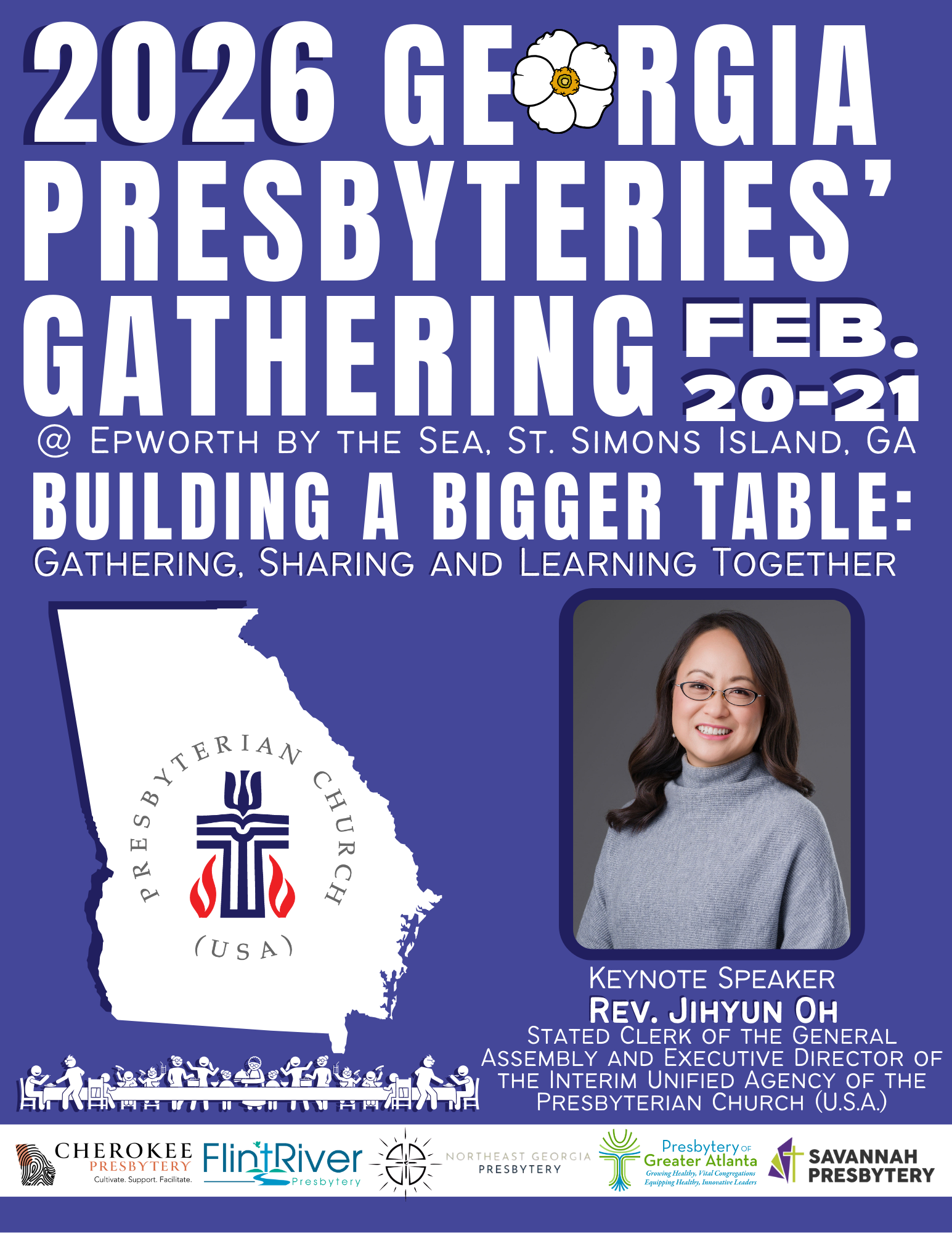 Join Presbyterians from across Georgia beginning at 1 PM Friday, Feb 20th,to learn and grow together. This event is designed to inspire action, spark meaningful conversations, and equip attendees through practical workshops that benefit churches of every size. Leave encouraged, equipped, and empowered to bring your congregation—and your community—closer to God’s vision of welcome, service, and faithful mission.